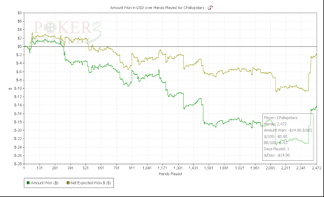 Well well well.. Started my day bad by playing 2-3 tables, and when I didn't hit, I started to make some extreme moves on those Speed tables - Didn't work, as you can see. I was sth like 4 BIN down, and the advise here would be: shut your poker App and F*** off. Jerk off, if you will. This time I made a different choice (which could have ended up pretty bad): I started to play nitty, and used 5-6 tables there. It's perfect example of how not to play. When your down, you quit, and try again tomorrow. This way you usually sign your death assignment, and will regret it tomorrow.